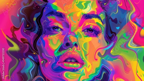 Abstract colorful portrait. Vivid digital art depicts a woman's face with vibrant, flowing colors.