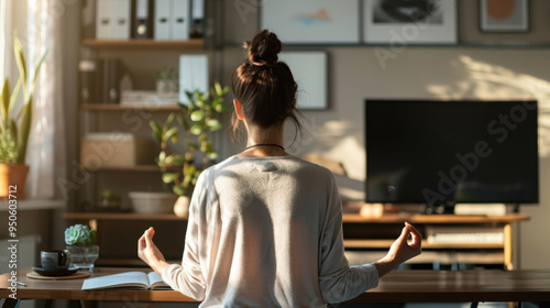 Woman Practicing Meditation at Home Office Desk in Sunlit Modern Living Room. Generative ai