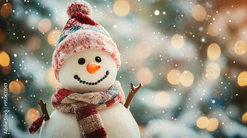 Na zimowym tle widać wesołego bałwana, który bawi się w śniegu z uśmiechem na twarzy.