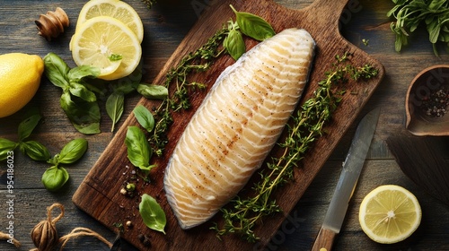 A fresh fish fillet being prepared on a cutting board, with herbs, lemon slices, and a knife nearby
