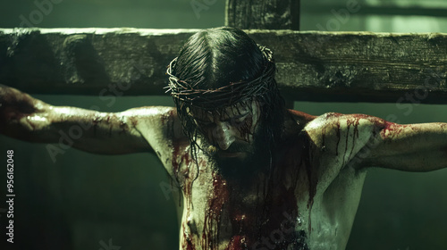 Jesus Christ on the cross, detailed religious symbolism, somber atmosphere