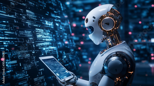 #8376347883d rendering humanoid robot working with data code on screen, artificial intelligence concept