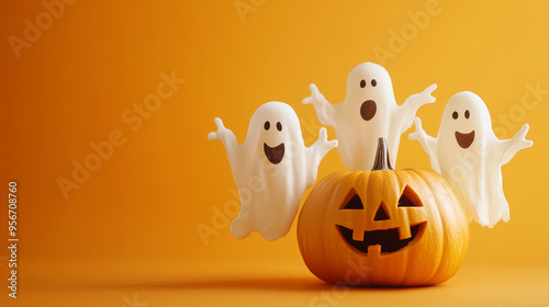 Zabawne duchy w towarzystwie uśmiechniętej dyni na jaskrawym pomarańczowym tle. Idealne na świąteczne dekoracje i kartki z życzeniami z okazji Halloween.
