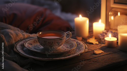 W domowym salonie, na tle eleganckiej tacy, znajduje się filiżanka herbaty oraz palące się świece, które dodają uroku i ciepła.
