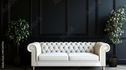 Nowoczesne wnętrze, w którym tapicerowane meble wyróżniają się na tle ciemnej, klasycznej ściany, tworzy efektowną przestrzeń.