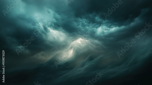 A dynamic scene of stormy weather with a dark sky, swirling clouds and lightning lighting up the horizon, creating a dramatic and intense background.