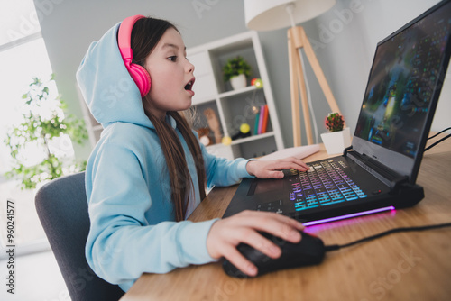 Photo of shocked cute adorable girl little user playing video game alone indoors house