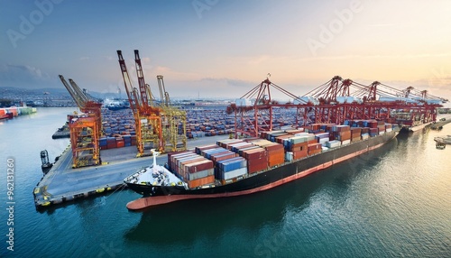 Aerial view of port containers with cranes handling international export and import logistics for business transportation, freight shipping, and distribution operations