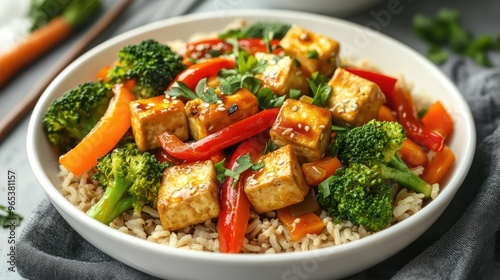 A vibrant rainbow stir-fry with tofu, bell peppers, broccoli, and carrots, served over brown rice in a white bowl