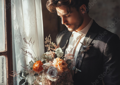 Pan Młody w garniturze stoi z kwiatami koło okna.