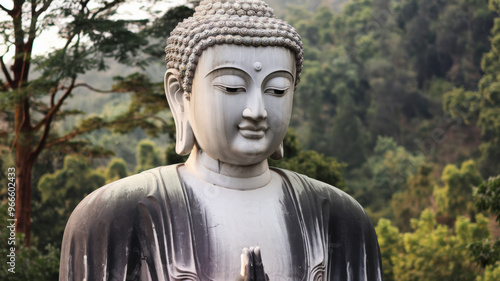 A photo of a large Buddha statue with a serene expression. The statue is made of white stone and is situated in a lush green forest. The background is filled with trees. The lighting is soft.