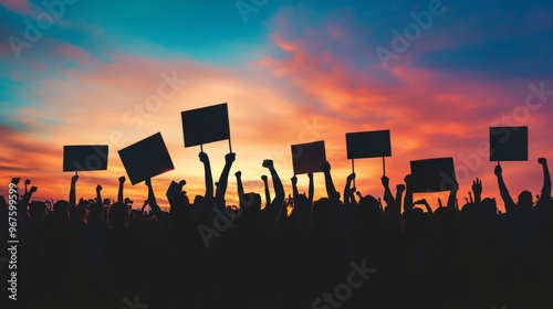 Silhouette crowd at a protest, raised fists and banners under the evening sky.