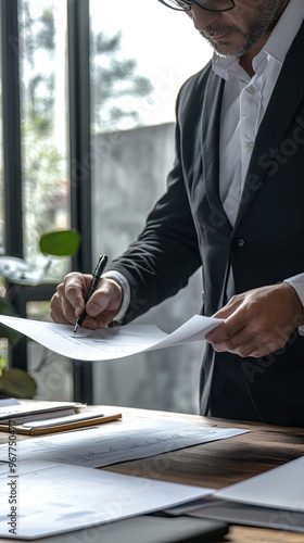 A businessman is reviewing project proposal with focused attention, showcasing professionalism and dedication in modern office setting