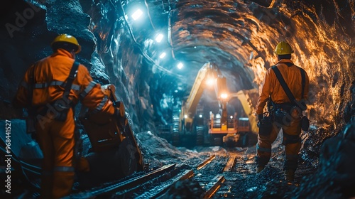 52. Miners using high-tech drills and machinery in a complex underground tunnel, illuminated by bright work lights