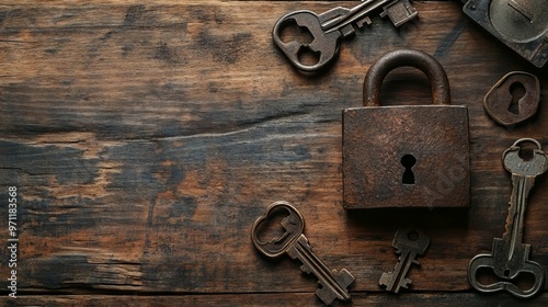 Rustic Padlock and Keys on Wooden Background with Scattered Old Lock Pieces. AI generated illustration