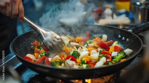 A chef stirring vegetables in a sizzling frying pan on high heat, with vibrant colors of the ingredients contrasting against the dark pan.