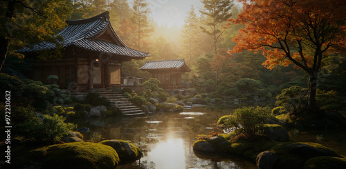 Ilustracja przedstawia piękny japoński ogród w promieniach porannego słońca. Przepływająca woda z lekką mgiełką dodaje magii. Na obrazie możemy podziwiać dużą dbałość o detale historyczne.