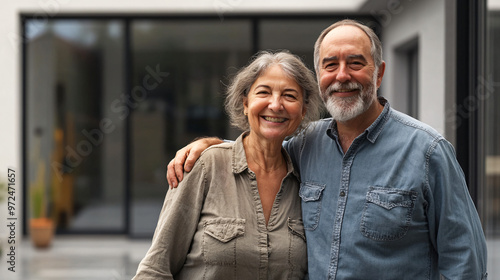 Senior couple happily posing in front of their contemporary home with arms around each other