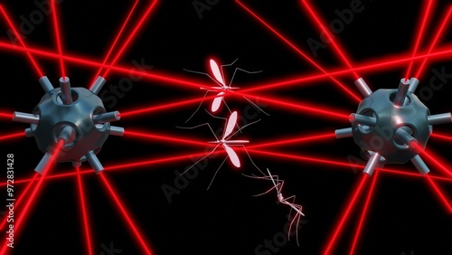 Photonic Fence. Laser beams killing mosquitoes. Lasers form barrier protecting against flying insects, zaps bugs with micro-bursts of high energy light. Insect killing lasers. 3d render illustration.
