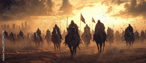 Mysterious ancient Arabian military soldiers troops on horseback in the desert background wallpaper AI generated image