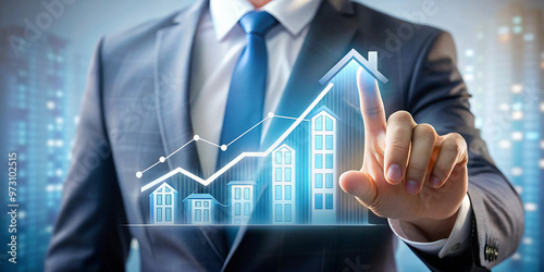 Sale growth concept. Businessman touching graph of increase in sales volume with shopping cart on virtual screen for ecommerce growth