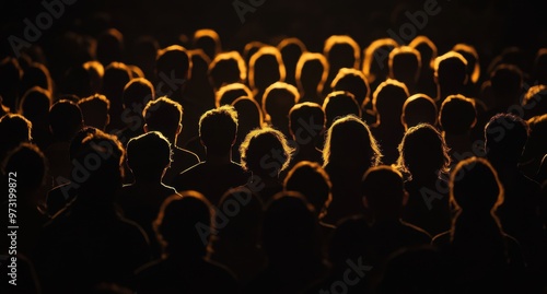 A crowd of people silhouetted against the black background, illuminated by warm golden light from their faces and bodies Generative AI