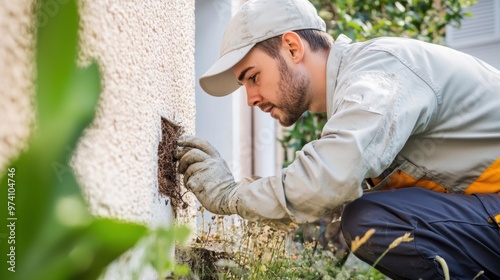 Pest control technician sealing cracks and crevices around a building to prevent insect entry