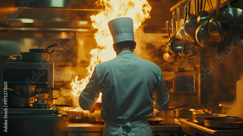 busy high-end restaurant cafe kitchen chef cooking cook stove fire large flame pans energy focus professional
