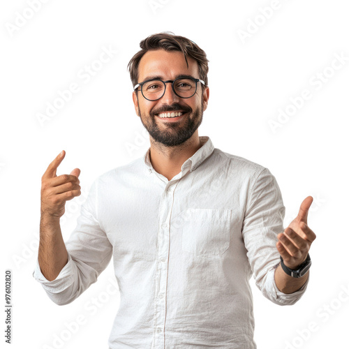 A product manager holding a prototype and gesturing as if explaining features with a smile. isolated on transparency background
