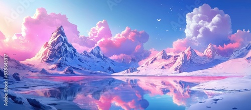 Illustration of a whimsical landscape featuring multiple peaks a tranquil lake and a sky adorned with fluffy clouds