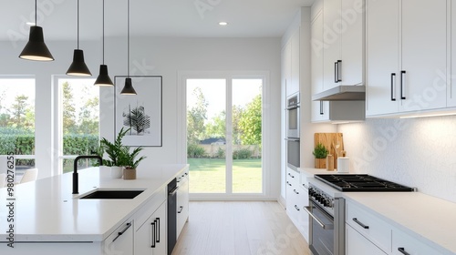 Modern kitchen with sleek white countertops, spacious design, no clutter, bright lighting, Sony a7 III, wide shot