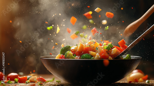 Vegetarian stirfry cooking in a wok, steam rising, digital painting, soft warm light, highly detailed vegetables, vibrant colors,