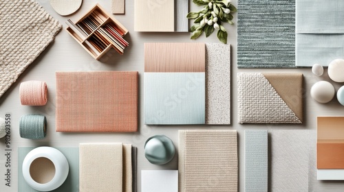 Modern flat lay composition in popular colors palette with textile and paint samples, lamella panels and tiles. Architect and interior designer moodboard.