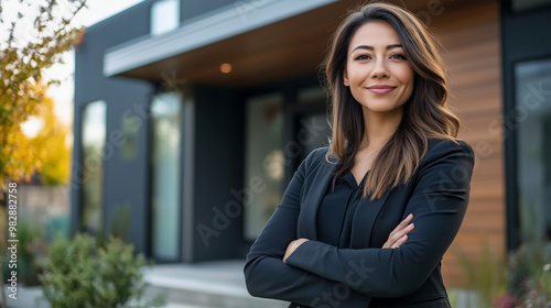 A woman in a black suit is standing in front of a house