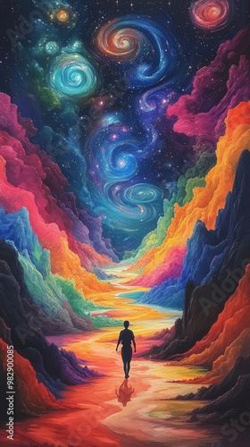 Illustrate a figure moving through a dreamlike scene at an angle