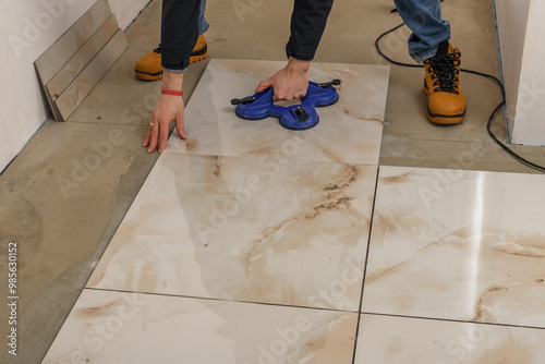 Majster układa duże płytki podłogowe na betonowej posadzce