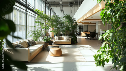 Przestronne biuro, w którym strefa relaksu z miękkimi kanapami i bujnymi roślinami emanuje spokojem.