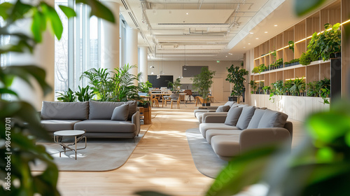 Przestronne biuro, w którym strefa relaksu z miękkimi kanapami i bujnymi roślinami emanuje spokojem.