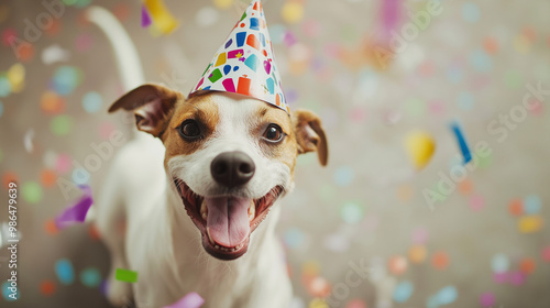 Pies w czapeczce urodzinowej z radością w oczach, skacze wśród spadającego konfetti, celebrując swoje urodziny pełne zabawy i śmiechu.