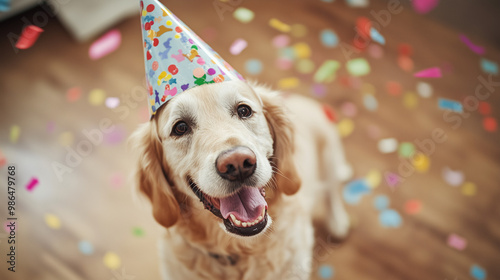 Pies w czapeczce urodzinowej z radością w oczach, skacze wśród spadającego konfetti, celebrując swoje urodziny pełne zabawy i śmiechu.