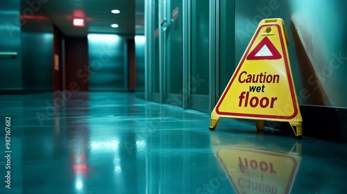 Wet floor caution sign in a hallway, highlighting safety measures to prevent accidents and ensure workplace safety in a modern building.