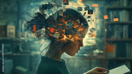 Głowa młodego człowieka, z której wybuchają cyfrowe informacje: wiadomości, powiadomienia i media społecznościowe. Ukazuje to zmaganie się z nadmiarem informacji i uzależnieniem od mediów.