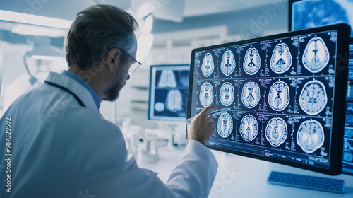 close-up of a neuroscientist examining MRI scans on an interactive touchscreen, surrounded by high-tech laboratory equipment in a bright, contemporary research facility, emphasizin