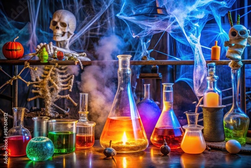 Spooky science lab setting with beakers, flasks, and test tubes filled with eerie glowing liquids, surrounded by cobwebs, skeletons, and Halloween-themed decorations.