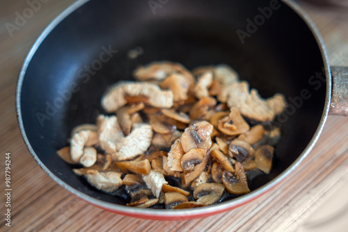 tantalizing dish of sauteed champignon mushrooms and succulent turkey meat on a petite skillet, showcasing a perfect blend of flavors and textures, ideal for a wholesome meal