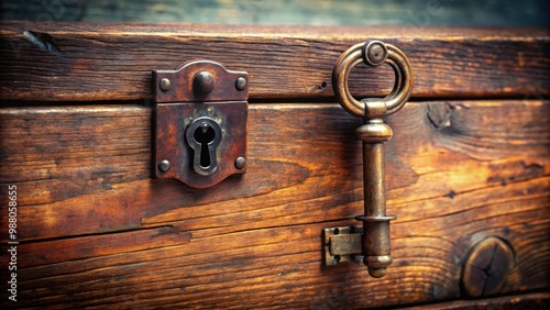 Vintage key inserted in the lock of an old wooden chest , vintage, key, lock, wooden, chest, antique, treasure, aged, retro
