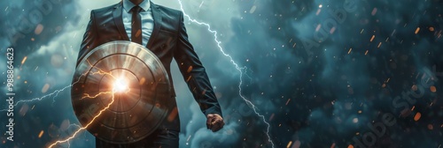 Businessman turned into thunder warrior,holding a lightning sword and shield ,preparation, protection, precaution and security in business concept