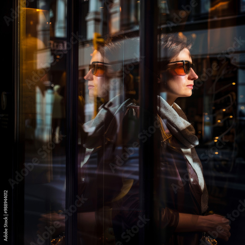 Beautiful woman considering next to the glass window shopping with reflecting.