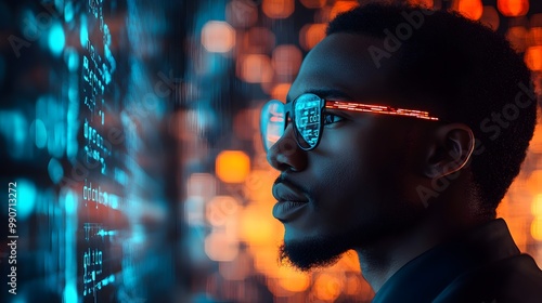 Side profile of African American cyber analyst working in an augmented reality environment, holographic AI analysis, glowing data encryption streams