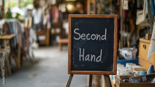 Vintage blackboard sign saying second hand on a wooden stand in front of a store entrance and blurred background